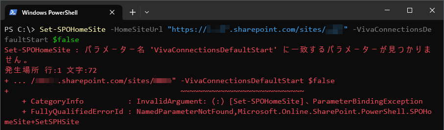 …が、こちらの手順で案内されているSet-SPOHomeSiteコマンドの引数"-VivaConnectionsDefaultStart"が機能しませんでした。