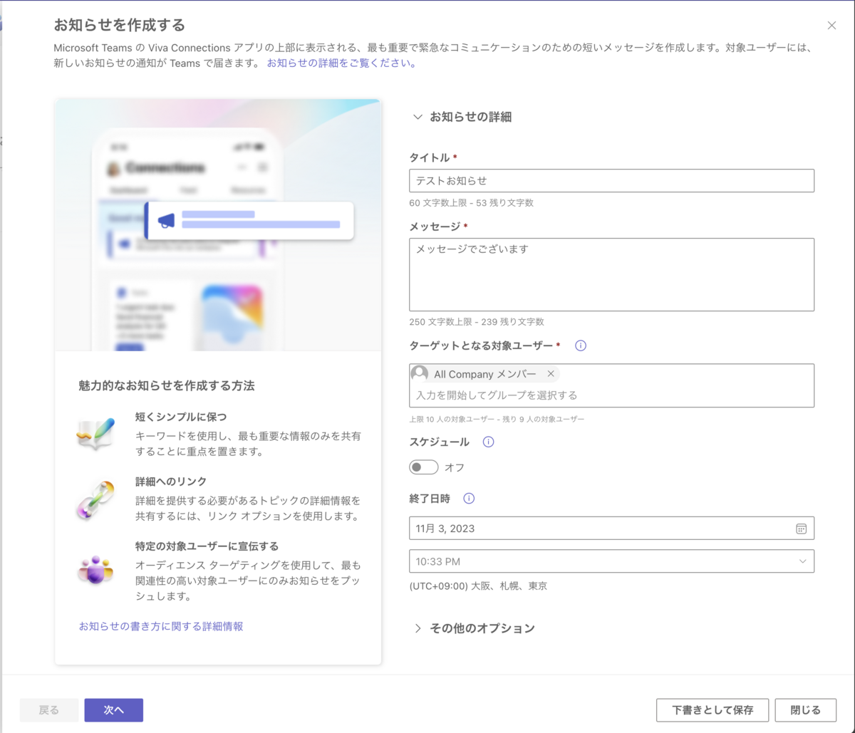 この機能でメッセージを送信するとViva Connectionsの最上部に表示され、各デバイスに通知される機能のようです。この機能はVivaライセンスが必要とアナウンスされていますが、Microsoft365ライセンスでもメニューに表示され、お知らせの作成画面までは見ることはできます。残念ながらお知らせの送信や下書き保存はエラーになってしまいます。