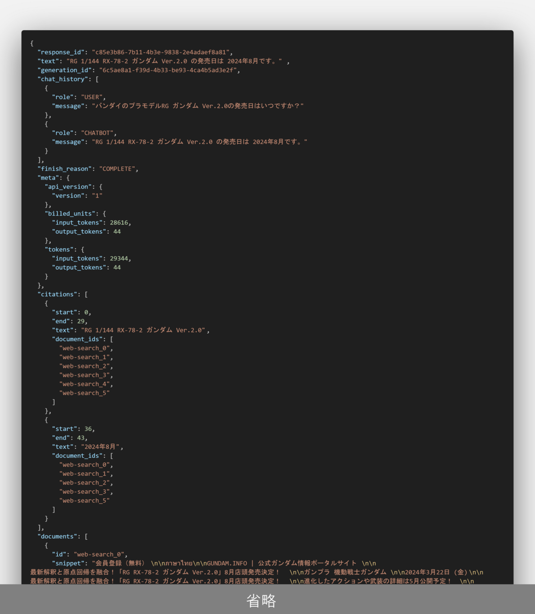 cohere APIには出力形式をjsonに指定するようなオプションは提供されていないようです。そこでプロンプトでjsonで返すよう指示をするとこのようにMarkdownのコードブロックとして出力してしまいます。プロンプトでこれを抑制しようと試行錯誤したのですが解決できませんでした。必ずMarkdown的にに出力される前提で出力結果を加工してしまえば対処は可能ですが、できればプレーンなjsonとして出力させたいところでした。